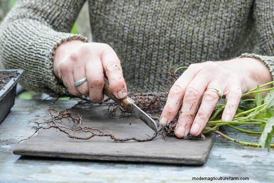 Trim off any hair-like roots and slice the main root into pieces. The length of these isn’t crucial – if you’re planting them into modules, cut them to the module depth.