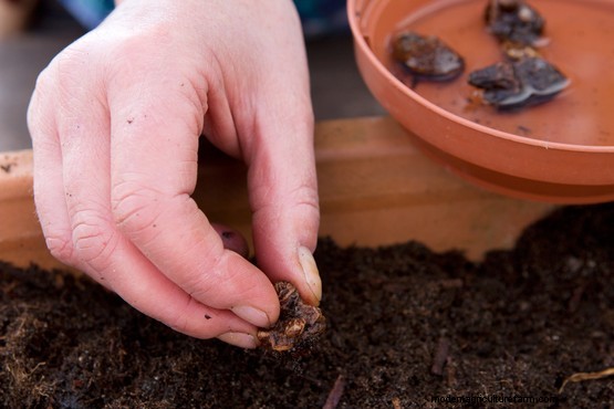 Plant about 8cm deep in pots or troughs of multipurpose compost. Space the corms 10-15cm apart.