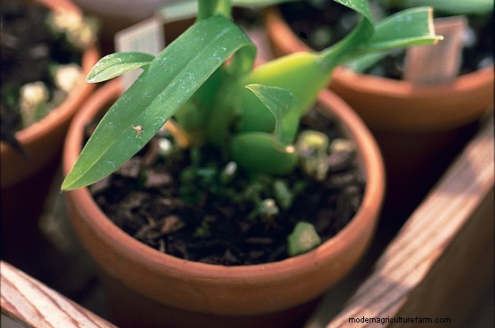 Stand the young orchid plants in trays in the greenhouse, well out of any direct sunlight. If the compost looks very dry, water the plants thoroughly until water starts to run out of the bottom of the pot.