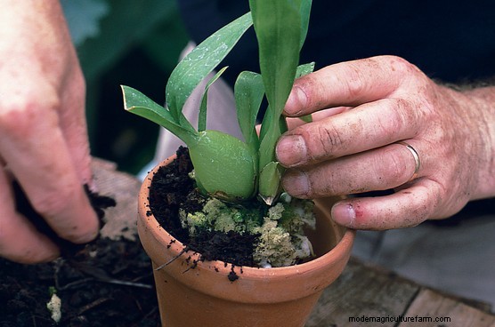As the orchid grows it will develop a strong, fleshy root system. When the roots fill the original pot the plant should be potted on into a slightly larger one.