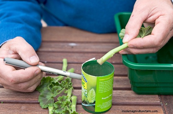 Remove flower buds and lower leaves from the bottom half of each cutting and cut the stem just below a node, where there is a concentration of the plant’s own hormones.