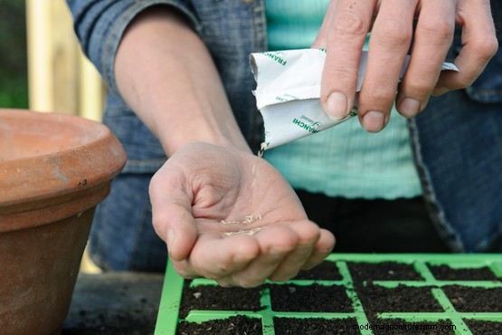 Fill modules generously with seed compost and level off so they’re filled to the brim, then sow one or two seeds in each – you can always pinch out surplus seedlings later.