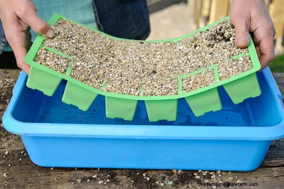 Sprinkle vermiculite or sieved compost to cover the seeds, then sit the tray in an inch of water to soak till the surface feels damp. Remove the tray from the water. Cover with a clear plastic lid or clear plastic bag. Put in a warm place to germinate.