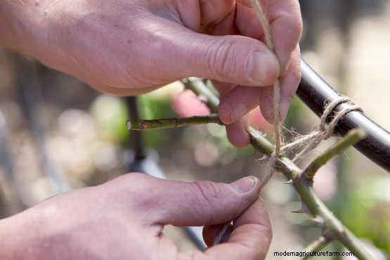 After pruning, tie the stems of your climbing rose to its support, ready for the growing season ahead.