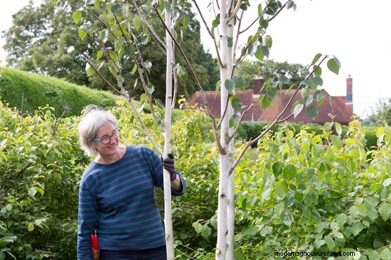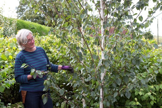 Assess the height to which you want to clear the single or multi-stem main trunk of branches. Ideally you should remove these lower branches when they are 2-3 years old to allow space under the crown of the tree for shrubs and other border plants – just above head height is convenient for walking under.