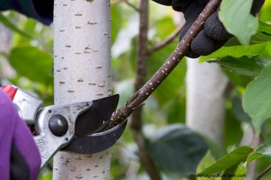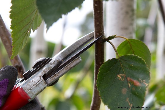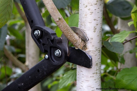 On young trees use secateurs to thin out a third of one-year-old side-shoots, cutting close to the main trunk but not damaging the ridge at the base of the branch or – in the case of this birch – the thin, decorative bark of the tree.