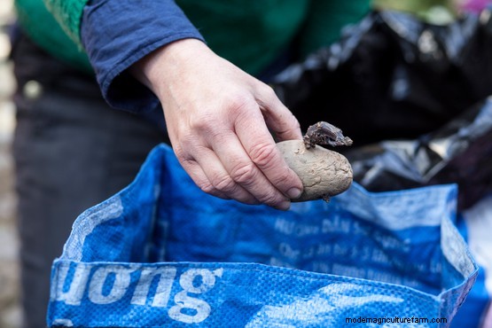 Start planting under cover in February. Plant where you want the bag or container to be, so that you don’t have to move it when it is full and heavy. Site where excess water can drain away. Fill to about one third with potting compost.