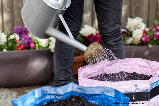 Either completely fill the container with compost when planting, or top up with compost as the plants grow, until the bag is full. If frost threatens, cover plants overnight with fleece or move to a sheltered spot.
