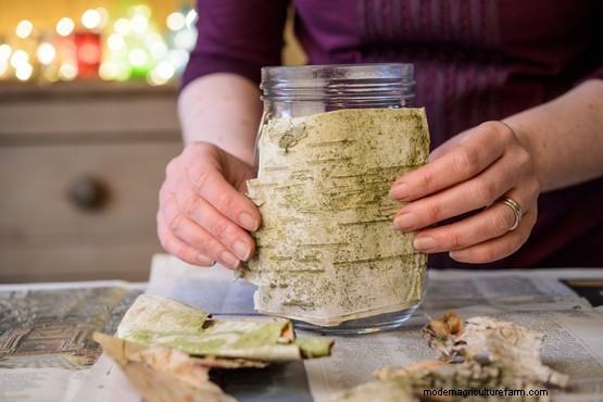 Starting with your clean jar, glue sections of birch bark to it. Hold them in place with elastic bands until dry.