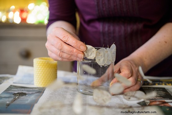 Make sure the seedpods are dry before beginning, as they won’t adhere properly if wet or damp. Apply a little glue to the base of each pod. Attach to a jar, starting at the top. Overlap as you go. Never leave lit candles unattended.