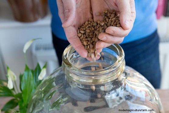 Put 5cm of horticultural grit in the bottom of the bottle for drainage. Add houseplant compost till the bottle is about a third full – breaking up any lumps with your hands. Choose lush foliage plants that thrive in low light and humidity.