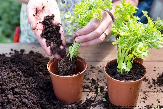 Replant the herbs into individual pots, setting each clump centrally so it sits at the same level it was in the supermarket pot. Gently firm the plants in.
