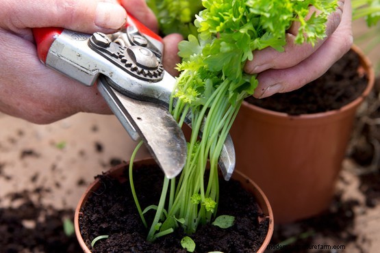 Cut back most of the soft upper foliage to lower buds. Then place the newly divided plants in a bright, warm spot and they’ll produce new shoots for use all season.