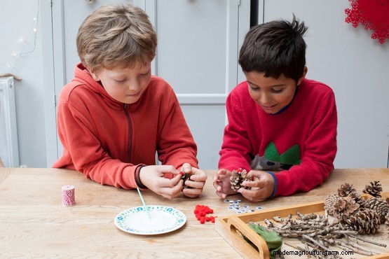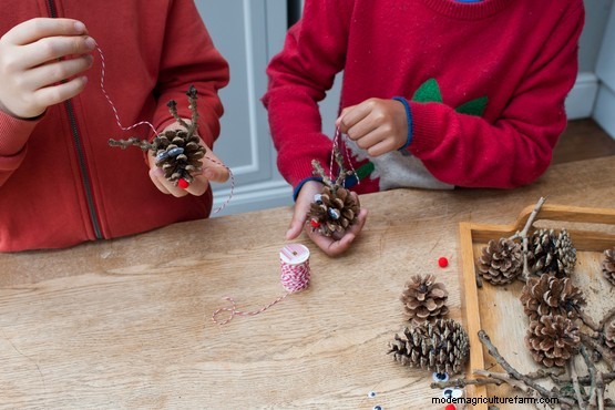 Once the glue has dried, take a length of cotton and tie around the antler end of the pine cone. Tie in a knot, ready to hang on your Christmas tree. Or use wire and attach them to a reindeer-themed wreath.