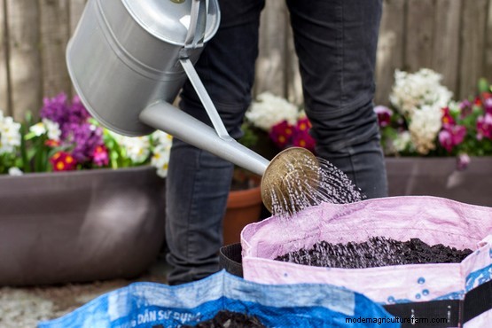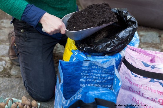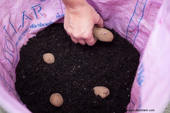 Water well to soak the compost, then allow to drain, then place the container in a well-lit porch or greenhouse to start sprouting. When shoots appear, add a further layer of compost to cover them. Keep repeating this until the bag or pot is full.