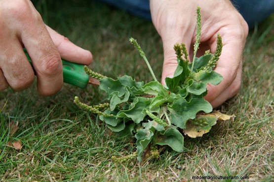 Use a garden fork to loosen the soil surface. Lift up the flat leaves then use an old, long-bladed knife to cut down into the soil around the tap root and remove it without breaking it. Don’t let mats of plantains form in your lawn as they’ll leave bare patches when removed. Pick off flower spikes to prevent seeding.