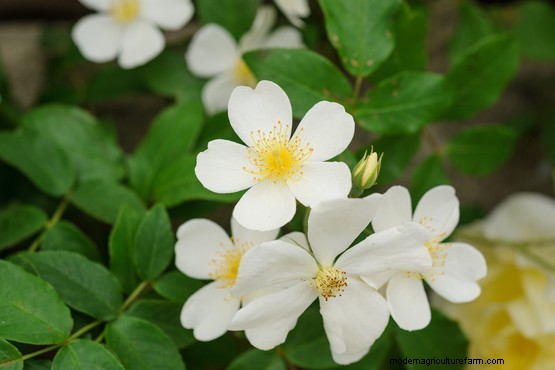 Rosa filipes ‘Kiftsgate’ is a stunning rose that bears masses of small, creamy white, musk-scented flowers in midsummer. They are followed by red, oval hips in autumn. A very vigorous rose that can grow very large.