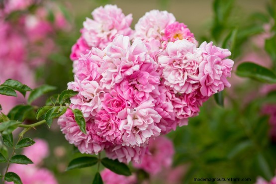 Rosa ‘Super Fairy’ is a gently rambling rose, bearing clusters of fully double, pink flowers. It’s less vigorous than many rambling roses, making it ideal for growing up an arch or trellis against a wall.