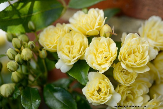 Rosa banksiae ‘Lutea’ flowers earlier than other ramblers, in April or May. It’s a vigorous, thornless rambler with small, glossy toothed leaves and hanging sprays of pale yellow, double flowers that have a light fragrance.