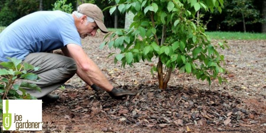 Place about three inches of organic matter such as shredded leaves, or ground bark, or wood mulch around the plant, at least out to the drip line. Further is better. Mulch helps retain much-needed moisture and helps keep roots cooler near the surface—a very important requirement for newly installed plants.