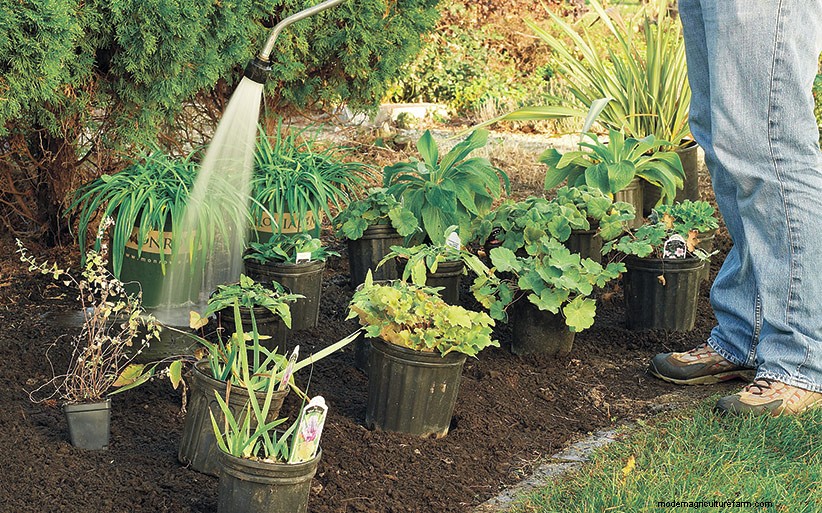 Set the potted perennials in place the night before you’re going to plant. It’s much easier to adjust the design now than after everything is planted. The plants in the photo above are getting a good preplanting drink. After all, you don’t want to plant wilted, dry perennials; it’ll be much too stressful for them. The garden soil gets a light sprinkling, too. Why the soil? The moisture is good for all of the beneficial bacteria that may have been disturbed as you worked the soil. You don’t need to water until it’s muddy, just moisten the surface a bit.