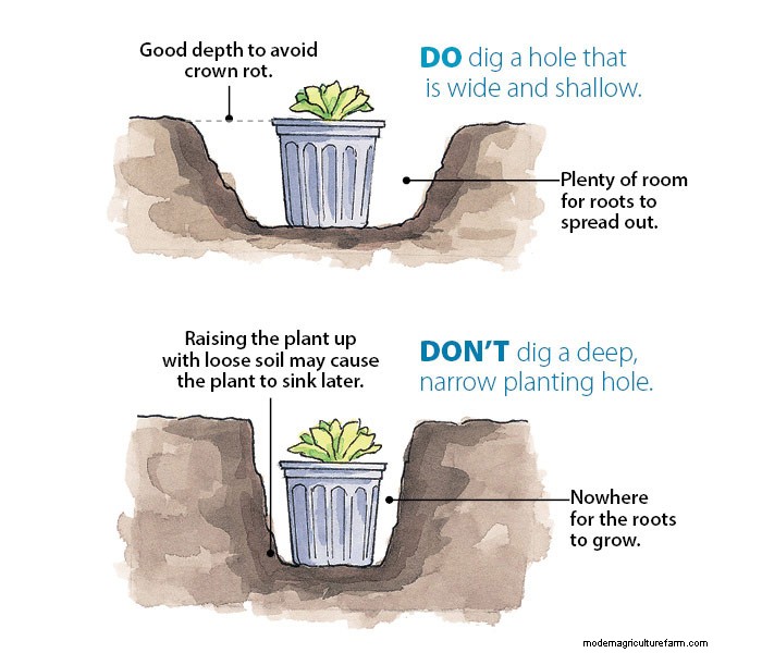Loosening lots of soil in the bottom of the hole could cause the plant to sink too deep after it’s watered. Later, especially over winter, water will collect in the low spot and rot the crown. Don’t dig the hole any deeper than the depth of the pot the plant came in. The illustration above shows you the “dos” and “don’ts” of hole size and shape.