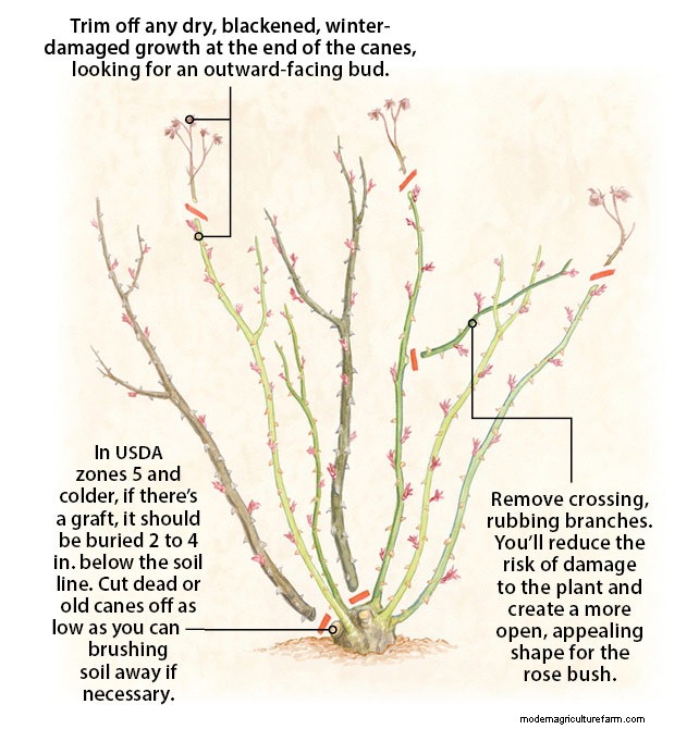 Most roses need a little spring cleanup, whether it’s a drastic pruning or just a light trim. Take a look at the illustration above to see what you need to prune out of your roses and why. Trim off any dry, blackened, winter-damaged growth at the end of the canes, looking for an outward-facing bud. Remove crossing, rubbing branches. You'll reduce the risk of damage to the plant and create a more open, appealling shape for the rose bush. In USDA zones 5 and colder, if there's a graft, it should be buried 2 to 4 in. below the soil line. Cut dead or old canes off as low as you can — brushing soil away if necessary.