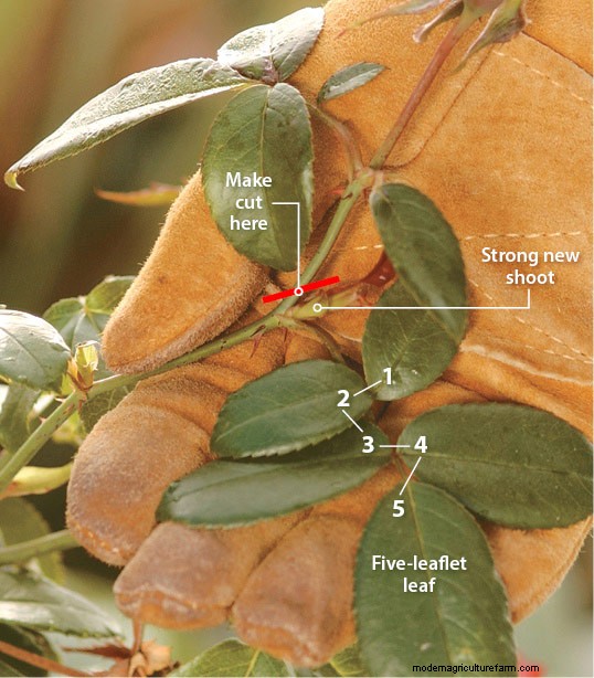 Then, when roses are going strong in the summer, they’re going to need a little deadheading to keep them blooming. The photo above shows a couple of things to keep in mind as you’re deadheading a rose. See the strong new shoot? That’s where the next flower will come from. And notice that the leaf just below that bud has five leaflets? Even if you can’t spot the new shoot on a stem, it’s best to cut just above a leaf like this one. Cutting back to a leaf with only three leaflets often results in weak stems.