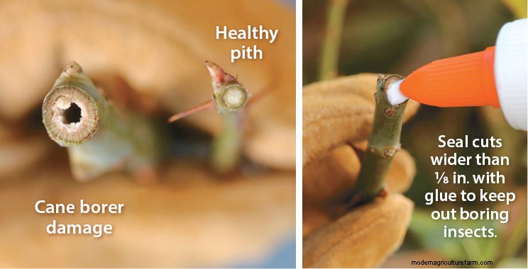 Anytime you cut a stem that is 1⁄8 in. in diameter or larger, you run the risk of cane borers, as you can see in the photo above left. These worms eat the tender pith in the stem, weakening the plant. But you can see the simple fix in the photo above right — seal each cut with a drop of white glue and they can’t burrow into the stem.