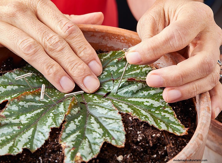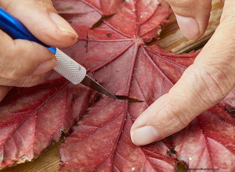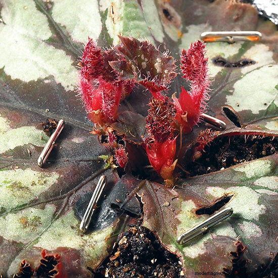 A few stones may help keep the begonia leaf from curling up and away from the mix, as well. Leave them in place until they start to get in the way. Start as many leaves as will fit in your tray or pot without the leaves touching.