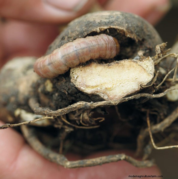 Iris borer is caused by the iris borer moth (Macronoctua onusta) that lays eggs in leaf litter in fall. When the larvae hatch in spring, they quickly find fresh new iris foliage to eat, gradually working their way down to the rhizome and finally out into the soil to pupate. If you notice brown streaks or collapsed foliage (or both), dig up the rhizome and check for a small caterpillar like the one in the photo above. Pesticides aren’t usually effective here so use fall cleanup to short circuit the borer’s life cycle. After killing the catepillar, try saving the plant by cutting away the rotten parts and dipping it in a solution of one part bleach to four parts water. Let it dry for a couple of days and replant.
