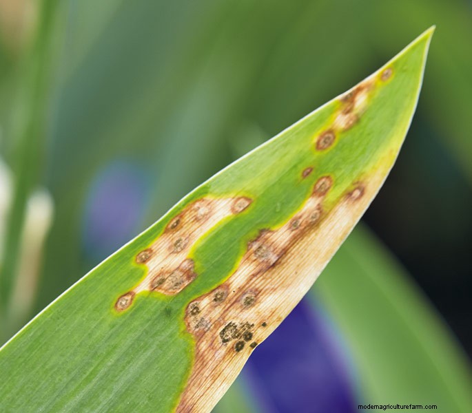 If your bearded irises have spotted leaves like those in the photo above, either bacterial or fungal leaf spot is the culprit. They’re hard to tell apart without a test from your extension agency. Both show up during periods of mild, wet weather, but the fungal type continues until temperatures get below freezing. Get rid of infected foliage right away. Follow it down to the rhizomes and cut it off with pruners that have been disinfected with one part bleach to nine parts water. If foliage test results indicate a fungicide will help, spray Daconil in spring when the foliage just emerges to knock out the fungus. When bacterial leaf spot is the culprit, you’ll need to dig out and discard those plants in the trash.
