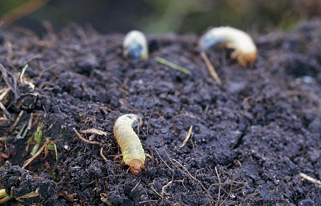 As autumn temperatures drop, the 1-in.-long, fat grubs go 6 to 18 in. into the soil to spend the winter.