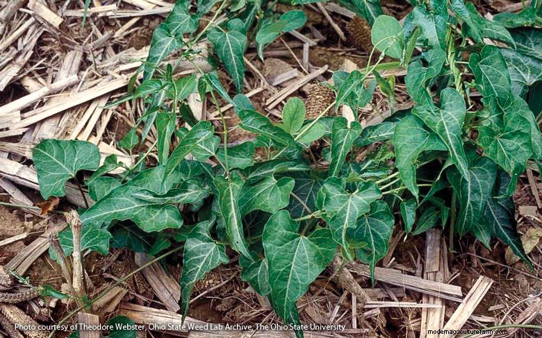 Climbing milkweed is a perennial vine with 3- to 5-in.-long heartshaped leaves with white veins and milky sap. Small clusters of white flowers result in 3- to 6-in.-long pods filled with feathered seeds that fly in the wind after the pod dries and bursts open. Multiplying by seed and spreading roots, this vine seems to pop up overnight and can completely cover shrubs and small trees in just a few weeks.