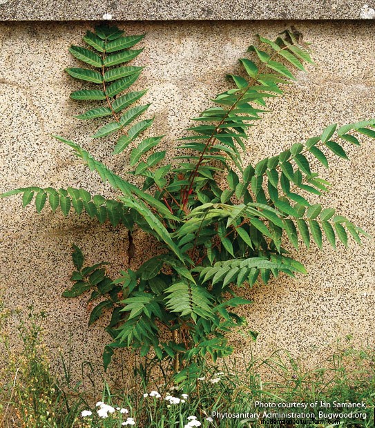 Tree of heaven will sprout almost anywhere, even in a crack in the sidewalk. It prefers full sun and dry soils.