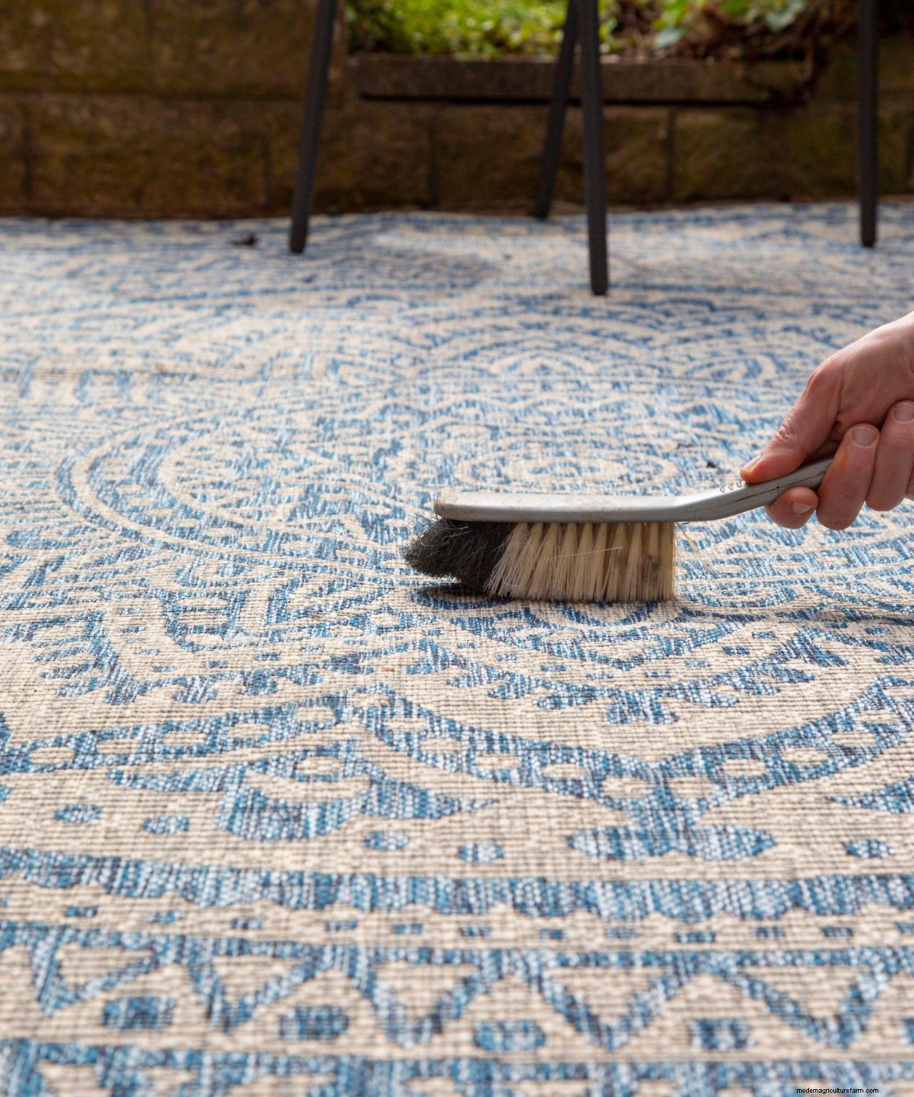 Power washers can certainly help if your outdoor rug has a build-up of ingrained dirt and also help to save time. 'Power washers can be used to speed up the process as well as for thorough rinsing afterwards,' agrees Joyce French. 'Sweep the rug gently from one side to the other after setting the nozzle to the fan setting.'