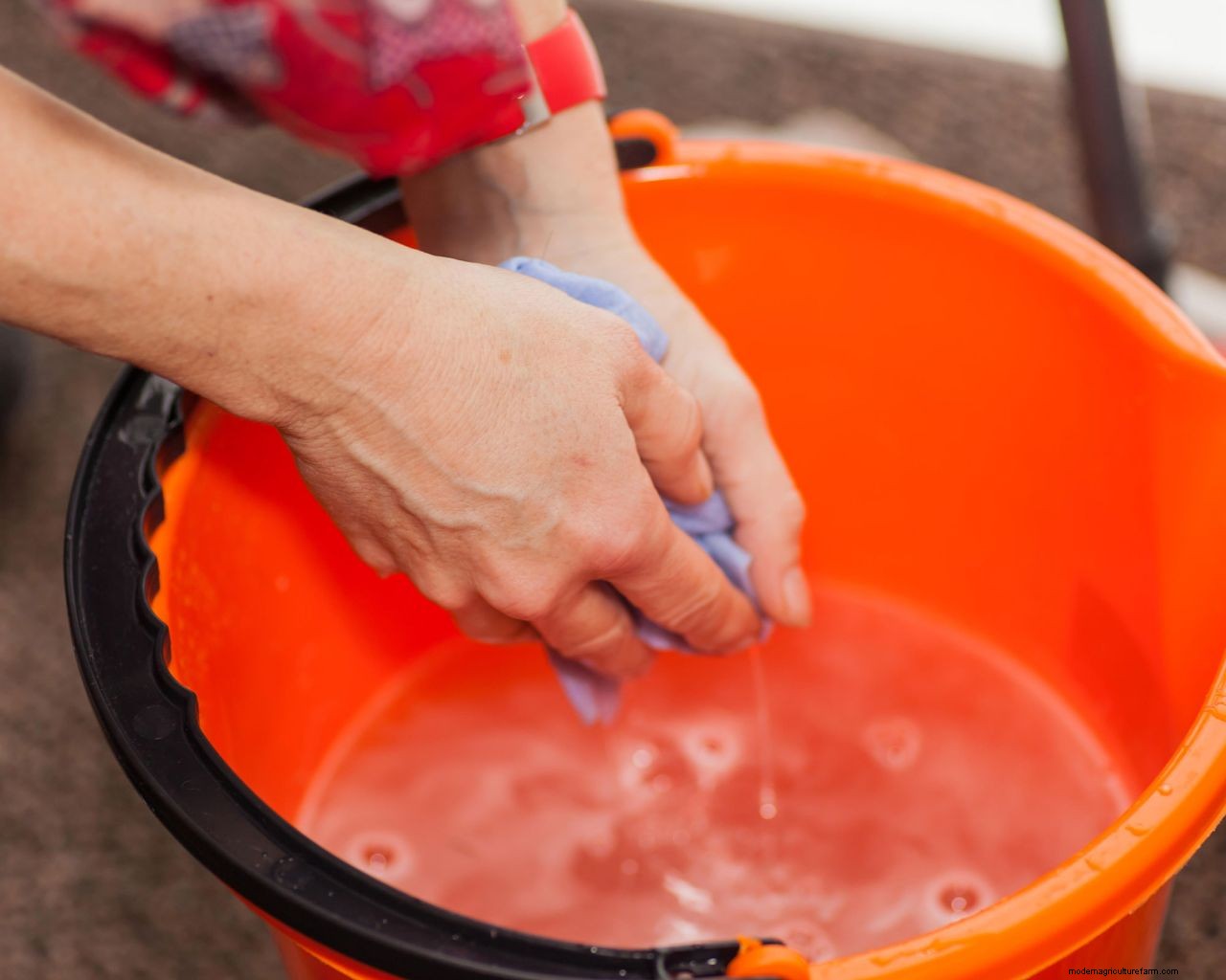 In a bucket, mix a small amount of the detergent or rug cleaner of your choice with cold or warm water. Apply the mixture to the rug with a soft brush or sponge.
