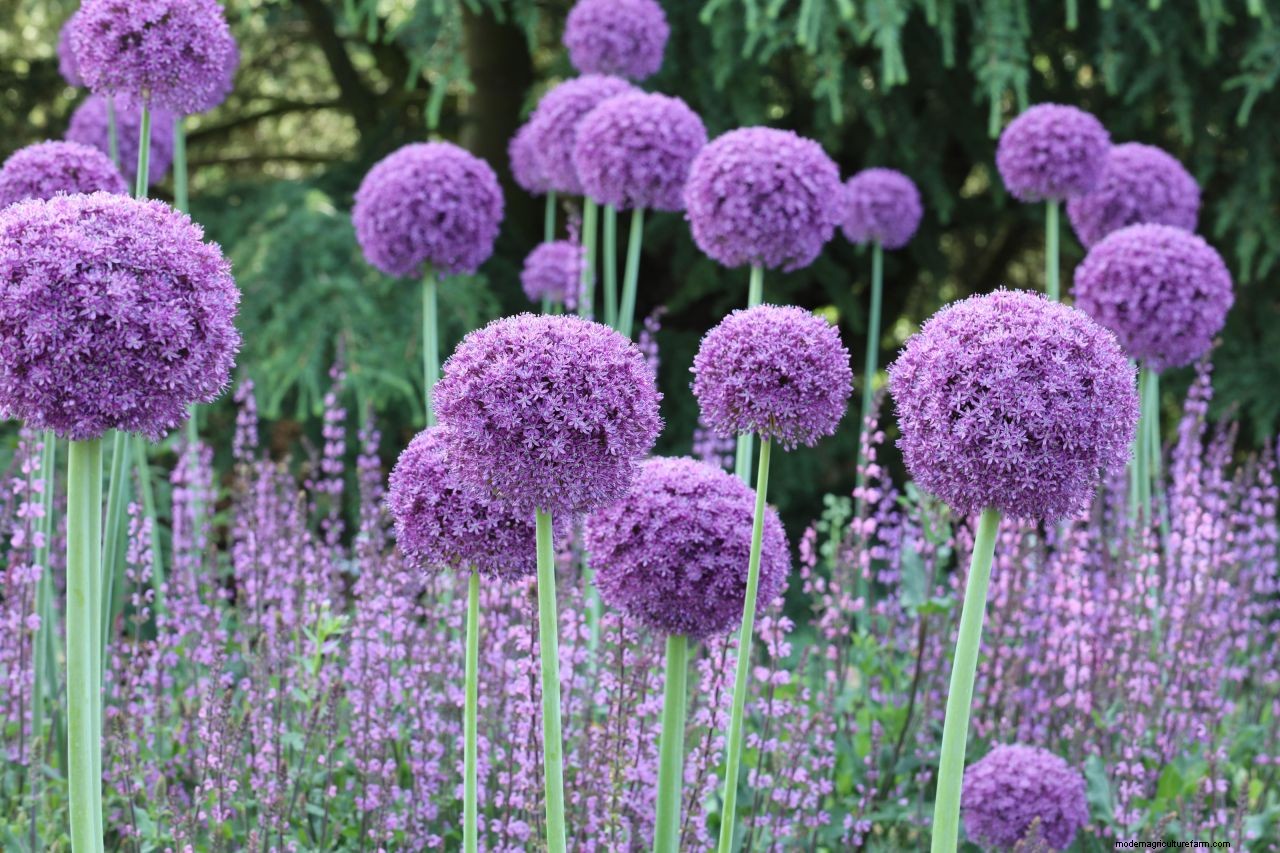 Big varieties such as ‘Purple Rain’ and ‘Globemaster’ work well when planted individually or in drifts. Shorter varieties such as sparkly silver filigree Allium christophii work well in pots.