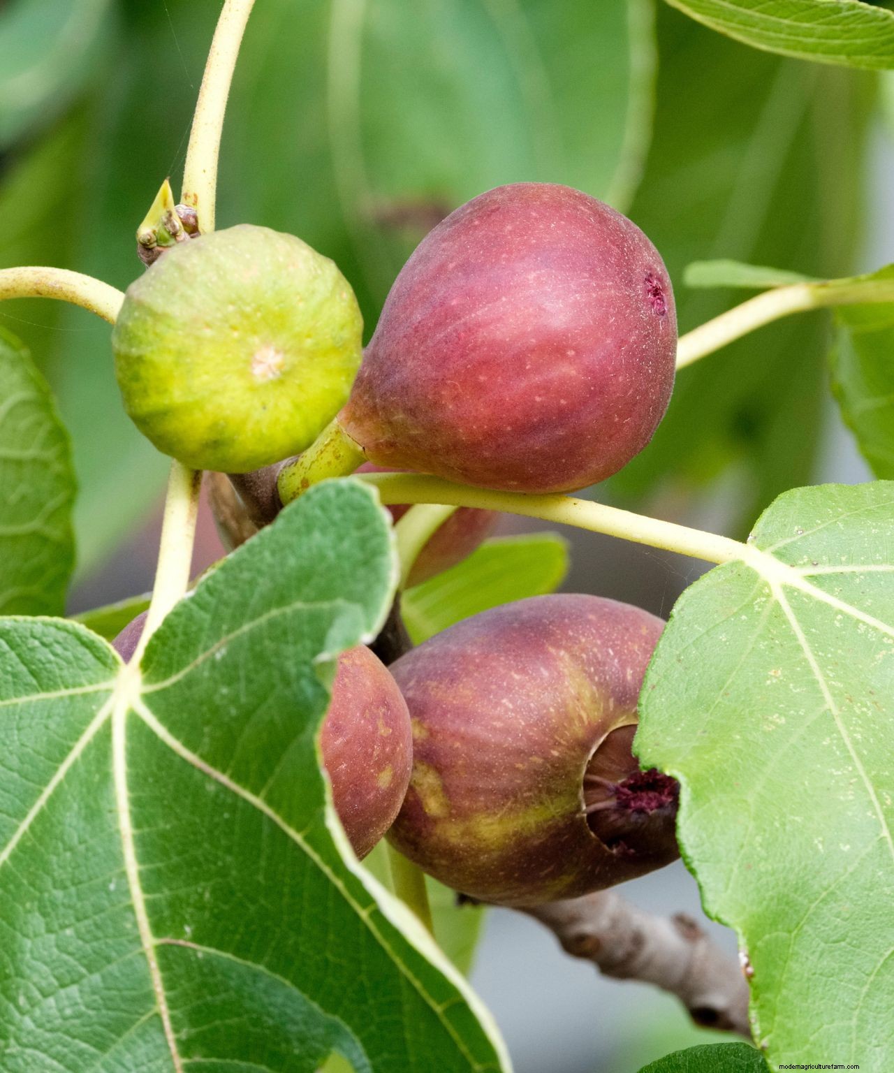 There are a few excellent tell-tale signs figs give to let you know they are ripe. If you give them a gentle squeeze, they feel soft and the skin may start to split. Depending on variety, colors deepen, stems bend and fruits hang down. You may even see a drop of nectar near the base of the fruit. This is your cue to consume them – fresh from the tree and warm from the sun. Or, if you fancy, they can be dried or turned into preserves.