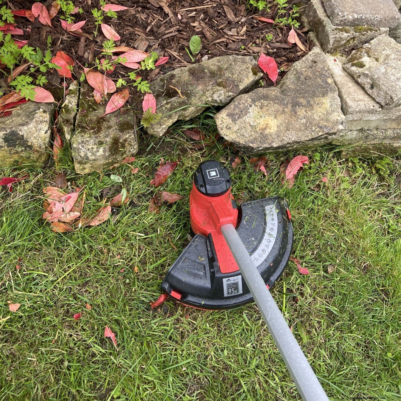 ‘Be careful when holding the trimmer so the head is in a vertical position. The goal is to run the line between the grass and concrete when edging along a sidewalk or driveway, or to keep the line on the edge of the grass when edging along a flowerbed. Try not to cut into the grass as it will cause scalping and possible long-term scarring and damage to your lawn.’
