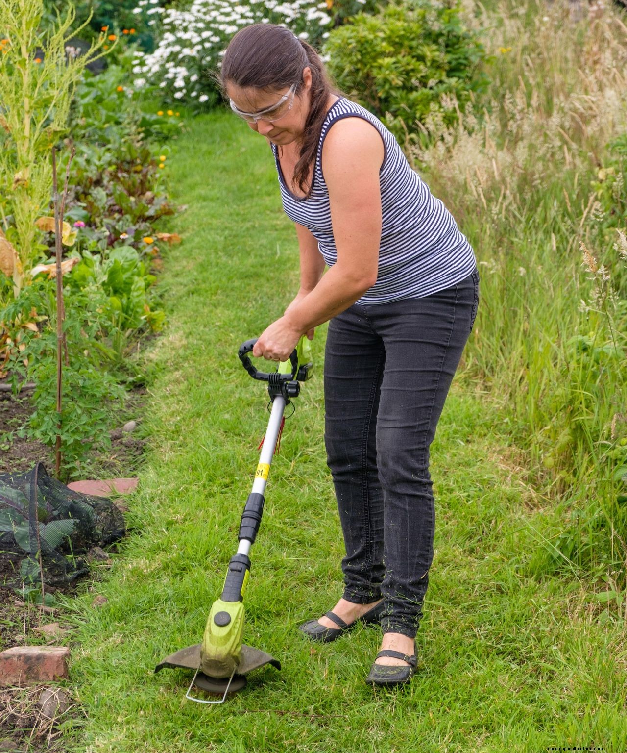 Cutting the grass on a flat surface? ‘You’ll want to hold the trimmer level against the surface,’ says Helene Keary.