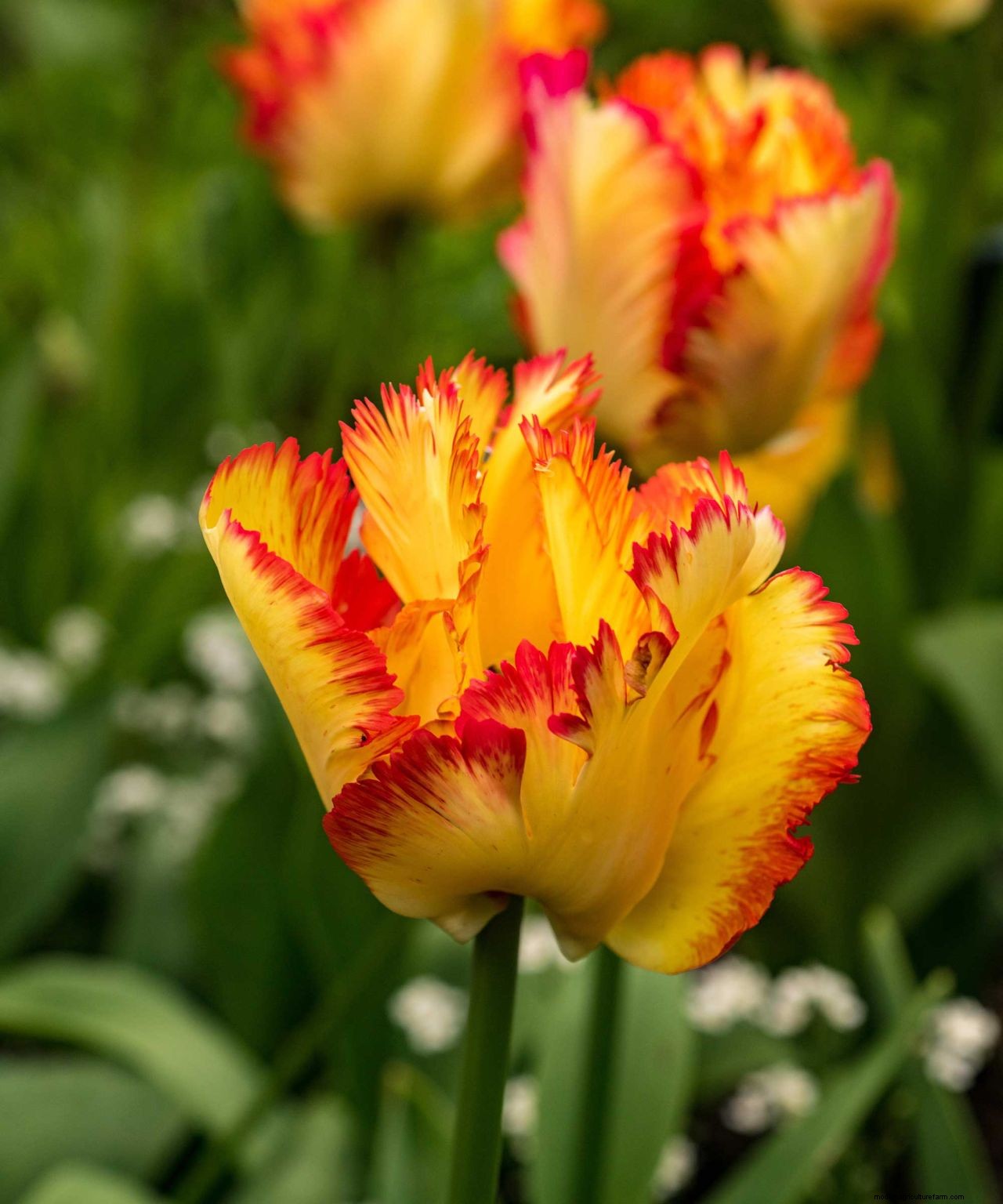 Some tulips have small, upright flowers. Then, there are double ones with a broader silhouette, and for extravagant frills and shot-silk colors, parrot tulips come into their own.
