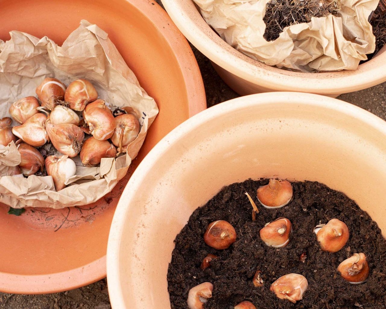 'Fit in as many as you can, although make sure they are not touching,' says Marcus. As a general rule of thumb, you'll want to keep them around a bulb's width apart. Avoid letting them touch the sides of the pot, too.