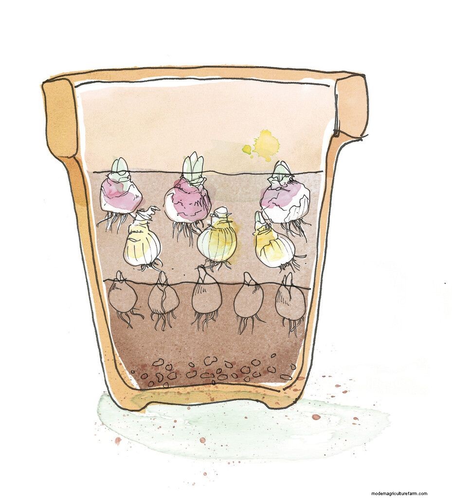 Just like a lasagne (hence the name), the idea is to build up your container in layers. The biggest bulbs (and last to flower) go in deepest, moving through to the smallest ones on top (earliest to flower). This will give you a continuous spring display, with the earliest bulbs at the top flowering in February, and the lower layers in April/May.