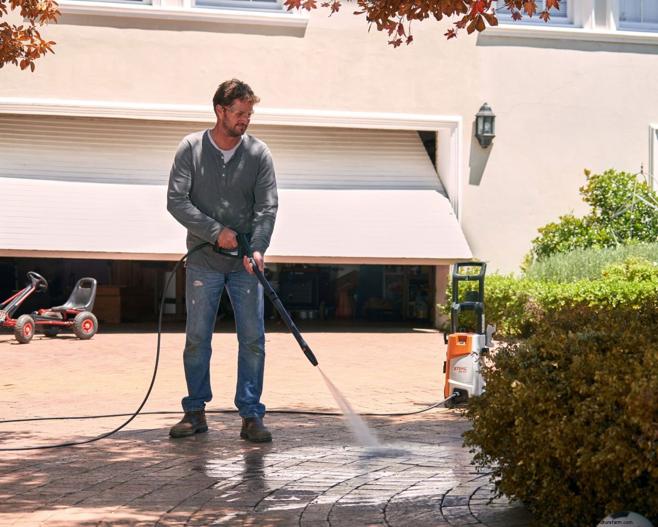 Need a deeper clean? Paul Hicks of Stihl says, 'Spraying on a cleaning detergent such as stone and facade cleaner before pressure washing can help remove tougher green growth and grime, helping return the stones to their original color and give an extra shine to your patio.'