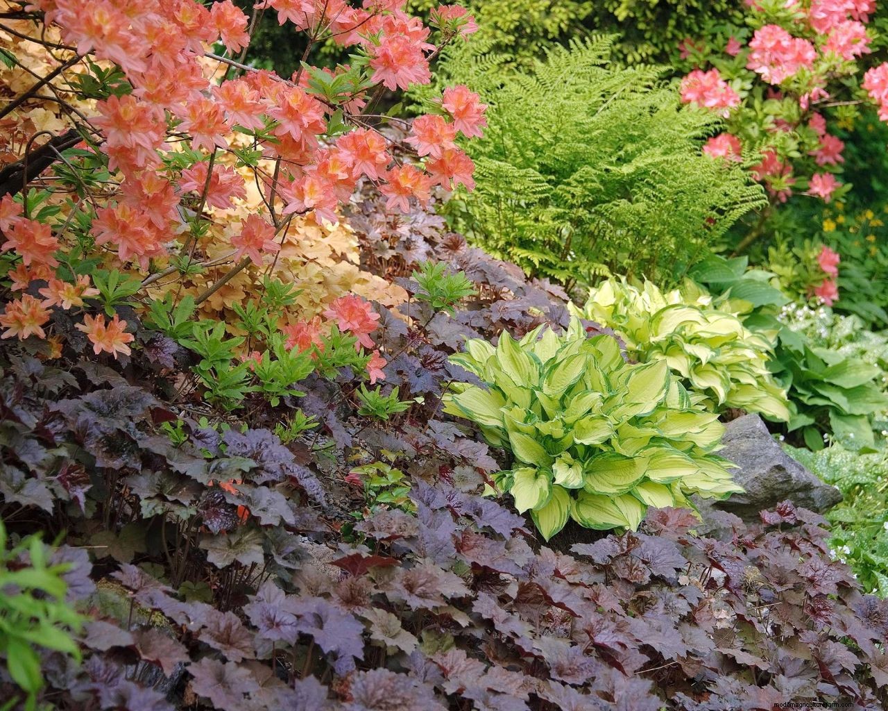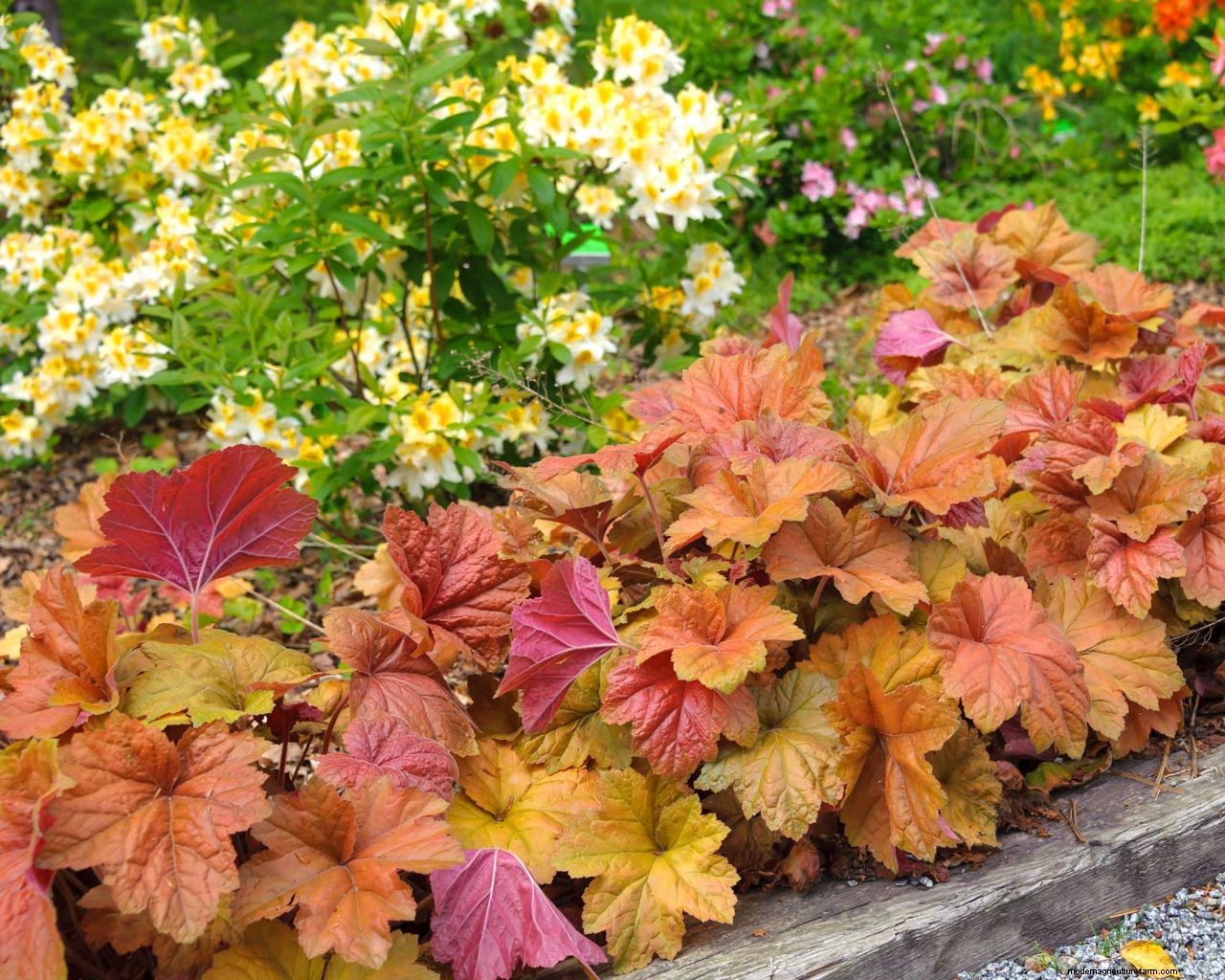 Alternatively, use heucheras as edging plants. They won't invade paths or spread away from where you plant them. 'Southern Comfort' (in a range of bourbon shades), is ideal for edging azaleas, while the frilly green-leaved 'Apple Crisp' is a fine universal edger.