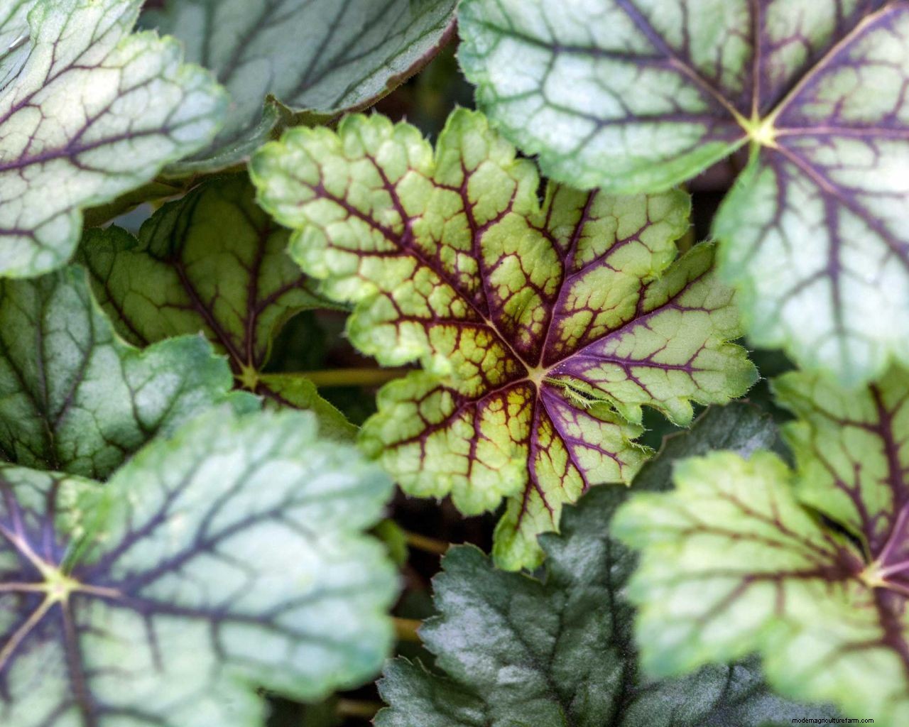 The chief glory of heucheras is their extraordinary variety of leaf colors, from almost-black to silver, crimson to purple, pink and marmalade-orange, and yellow, lime, and gray. Often they offer two or three colors in an intricate pattern with dark leaf veins. Some even change color as the seasons pass.