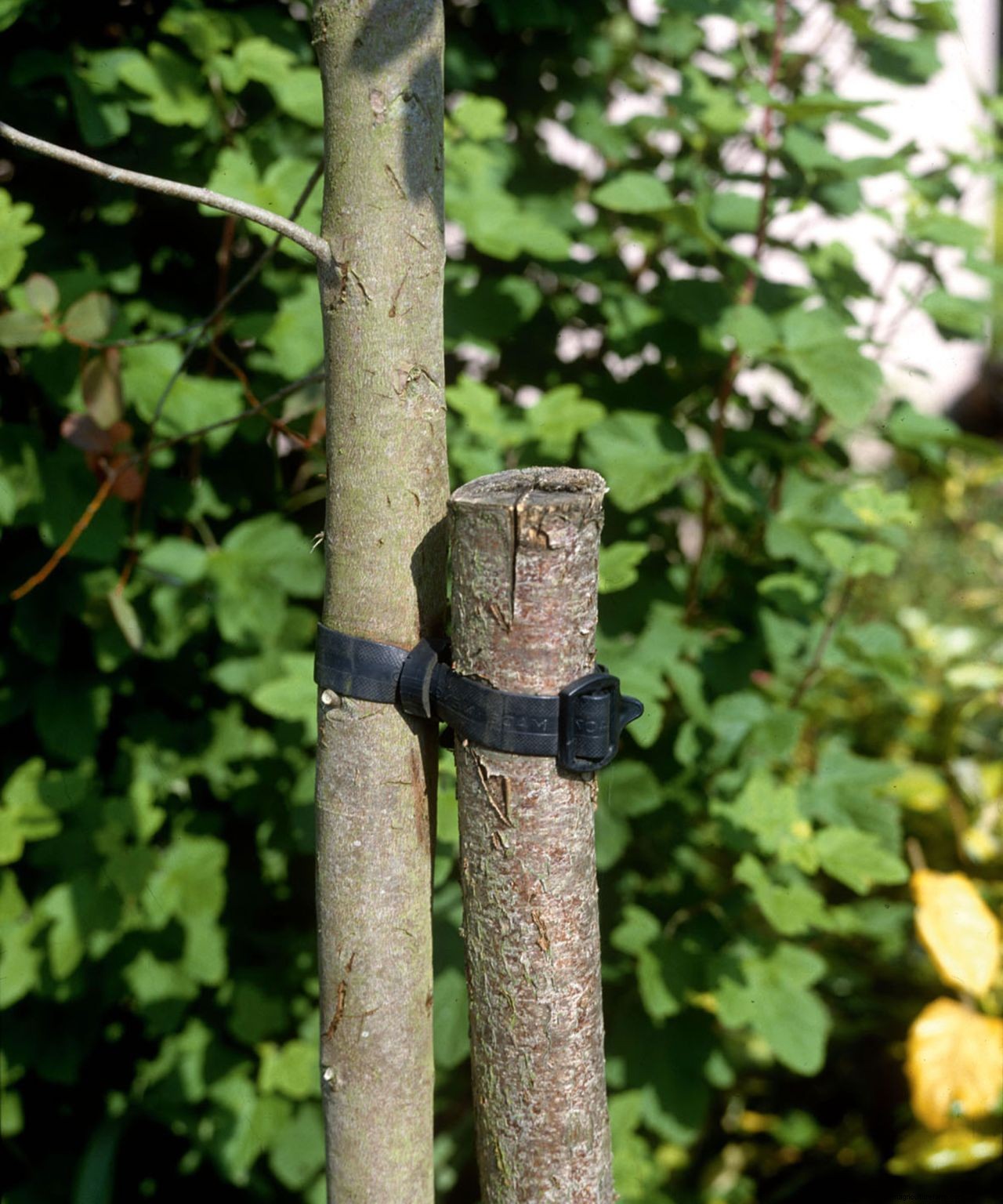 It's also important to remember that support is important until new root growth stabilizes the tree. To do this, use two short stakes, one on either side of the rootball, with one tree-tie securing the tree to each stake. The ties should be low down, 18-24in (45-60cm) above the ground.