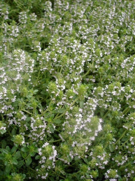 Outdoors, German thyme is perennial in zones 5 to 9, lemon thyme in zones 7 to 9. Easy to grow, thyme needs little care except for a regular light pruning after the first year. Do this after the last spring frost, so that the plants do not get woody and brittle. Pinching the tips of the stems keeps plants bushy, but stop clipping about a month before the first frost of fall to make sure that new growth is not too tender going into the cool weather. Cut thyme back by one third in spring, always cutting above points where you can see new growth, never below into the leafless woody stem. Lemon thyme is more upright and more vigorous than the other thymes. In the North and cold climates, cover with pine boughs after the soil freezes to help protect from winter damage. In zone 10, thyme is usually an annual, often succumbing to heat and humidity in mid-summer.
