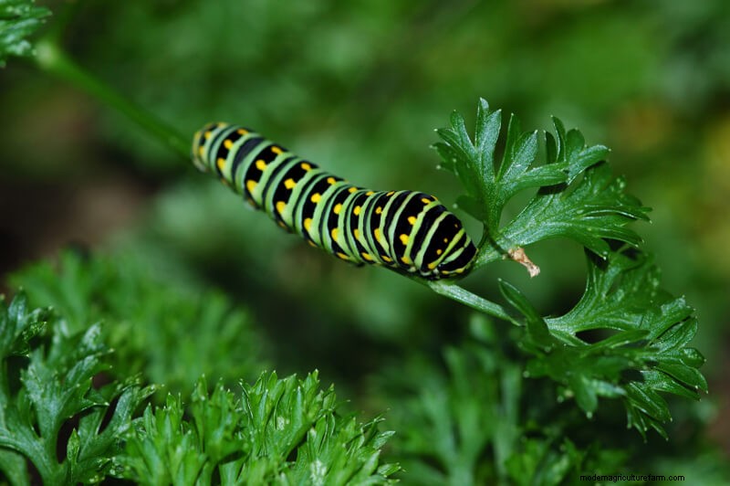 The most common caterpillars on parsley, as well as dill and fennel, are the colorful larvae of the black swallowtail butterfly. These plants are host plants, providing nourishment for the juvenile form of an elegant adult. First, you should consider leaving them alone. As soon as they move on to the next step in metamorphosis, the pupae, you can cut off damaged leaves and fertilize your plant, and it should recover. If that isn't acceptable, try moving the caterpillars to an alternate plant such as Queen Anne's lace, which is commonly seen on roadsides and along the fence lines of old fields. Just cut the leaves on which the caterpillars are feeding, place them at the base of the new host plant, and wish them well.
